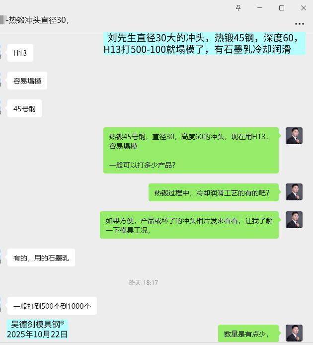 刘先生说,我有一款热锻压模具冲头直径30,高度60用什么材料好,热锻45钢材质,现在用H13,打500-100就塌模了。