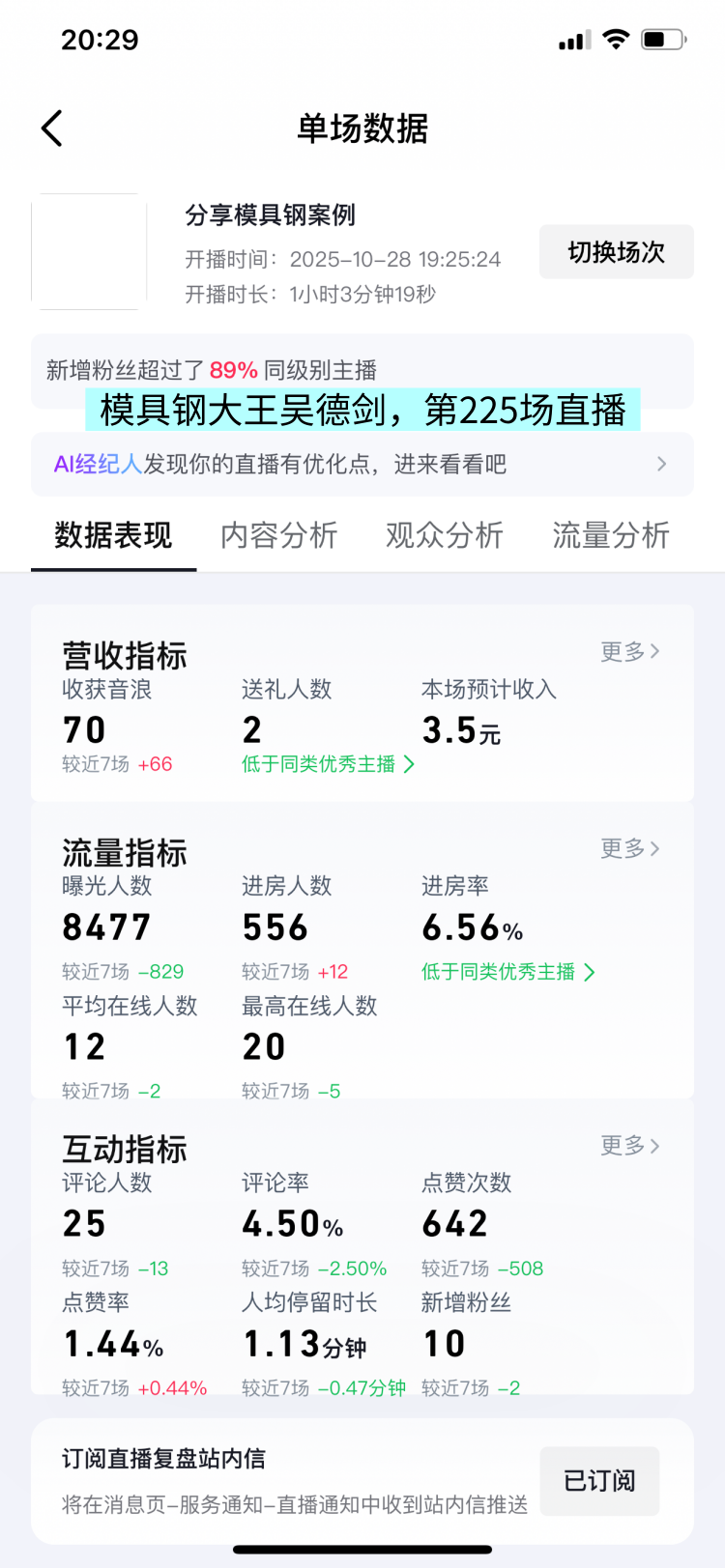 2025年10月28日,我做了1小时的直播,这是我第225场直播。