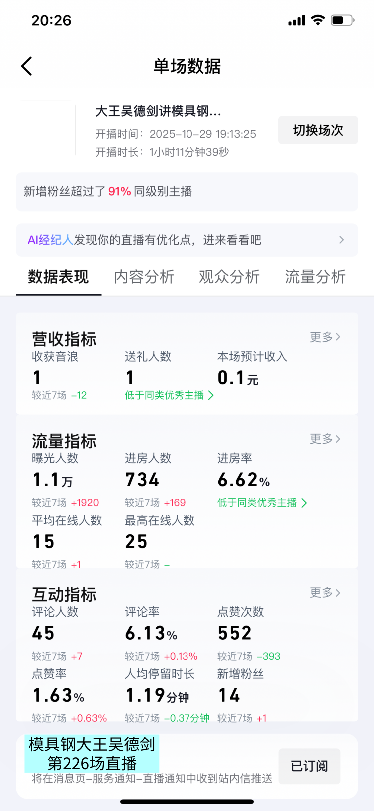 2025年10月29日,我做了1小时10分钟的直播,这是我第226场直播。