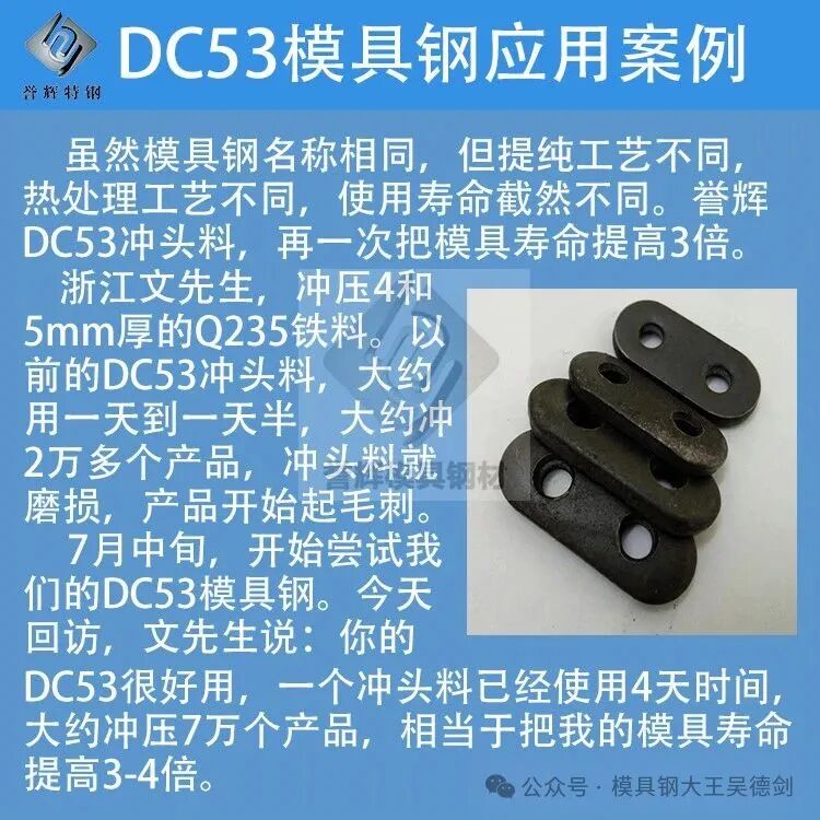 一个冲头一般磨4次就要报废,誉辉DC53单次寿命就提高了4倍,相当于一个冲头抵4个冲头用,一个冲头的总寿命提高16倍。一个冲头抵4个冲头用,4个冲头的加工费,已经足够买材料,所以对于文先生来说,誉辉DC53是免费购买的,一点都不夸张。
