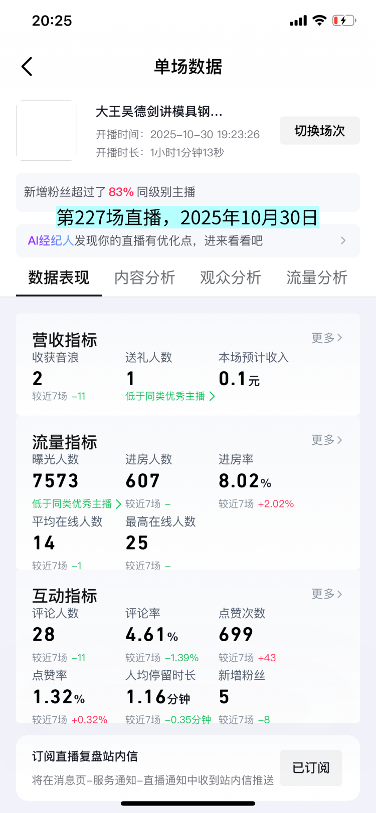 2025年10月30日,我做了1小时的直播,这是本周的第4场,也是我的第227场直播。