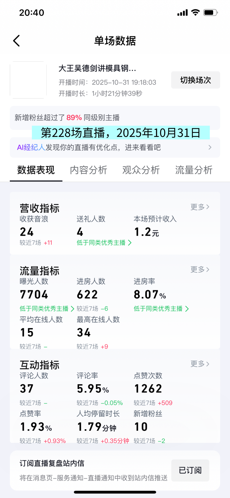 这场直播的曝光人数7704人次,观众人数622人,人均停留时长1.79分钟,这场数据跟上一场差不多,但还是看到几个飘红的数据,说明某些数据是有提升的。