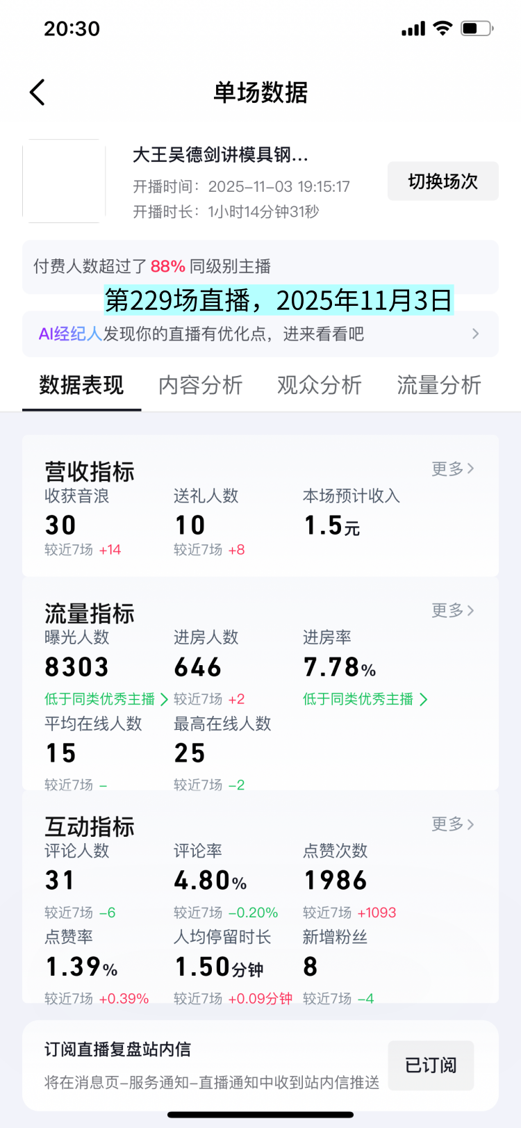 2025年11月4日,我做了1小时的直播,这是我第229场直播。