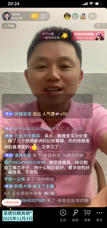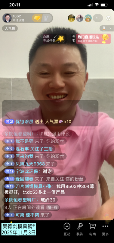 这场直播间的提问比较宽泛,冷冲模的、拉伸模的、塑料模的芯子用料,加玻纤的增强塑料模具用料,热锻模的,反正有关模具的都包含了,这样看来,模具用料遇到问题的人还很多,直播有的搞。