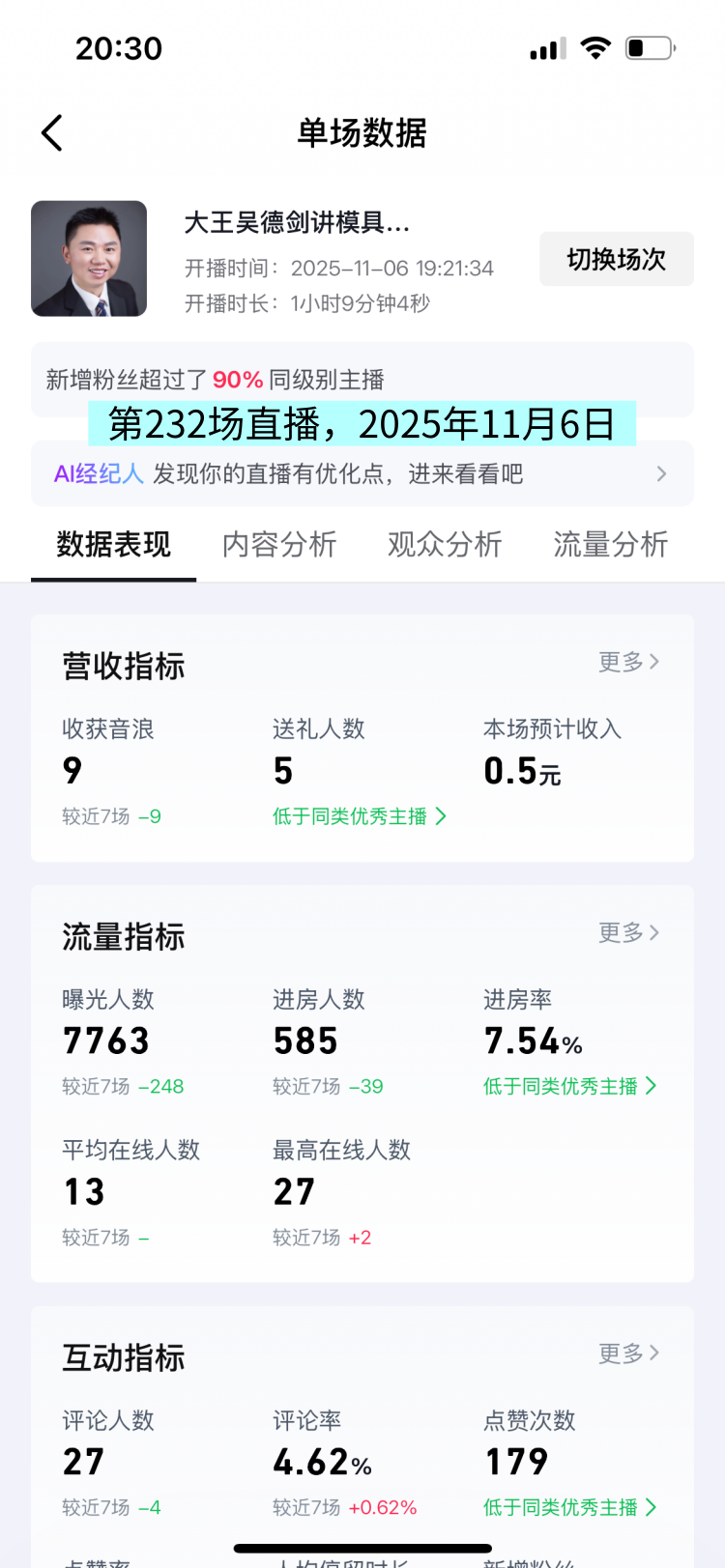 昨天的11月6日,我做了1小时直播,这是我第232场直播。