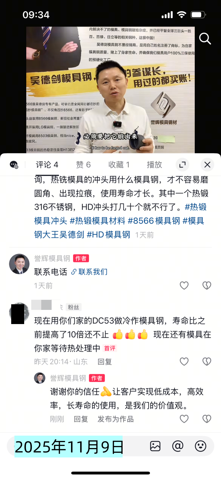 周末早上,收到网友在视频下面评论说:现在用你们家的DC53做冷作模具,寿命比之前提高了10倍还不止,现在还有模具在你家等待热处理中。