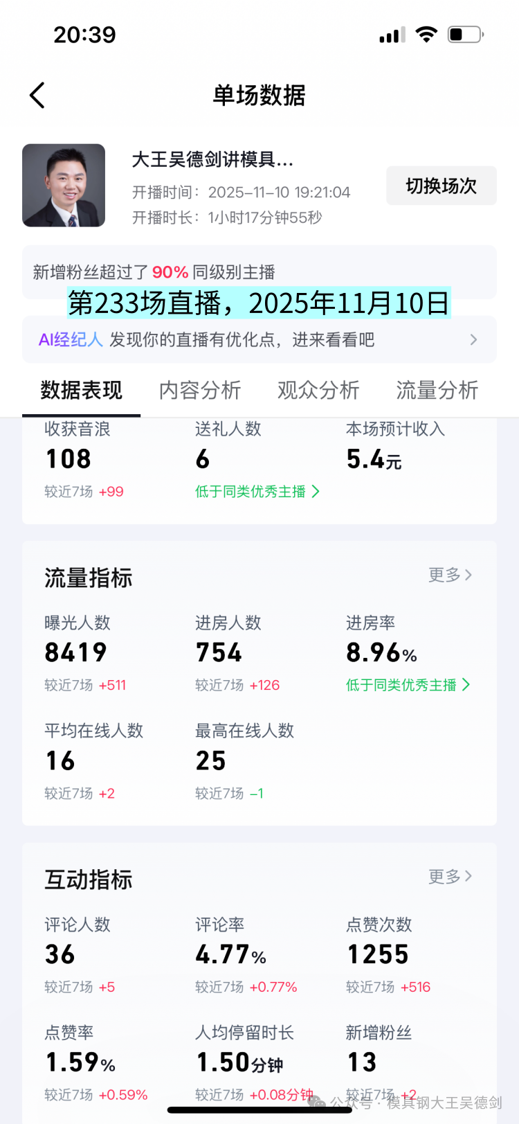 这场直播的曝光人数8419人次,观众人数754人,平均观看时长1.5分钟,这场数据有所提升,很多数据都飘红了,意外收获。
