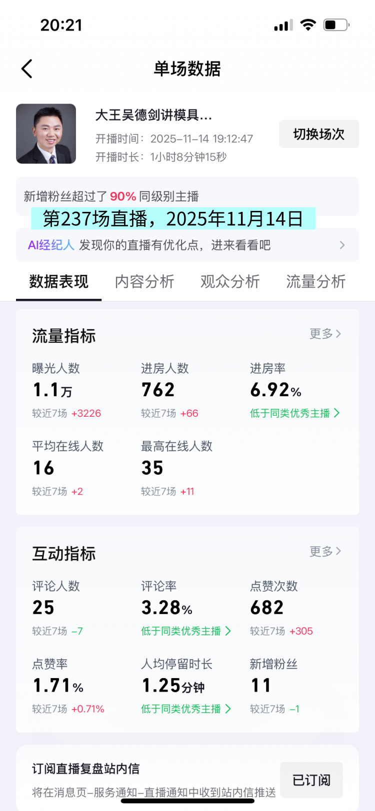 这场直播的曝光人数1.1万人次,观众人数762人,人均观看时长1.25分钟,这场直播数据挺好,最亮眼的数据是最高在线人数35人,新增粉丝11人。