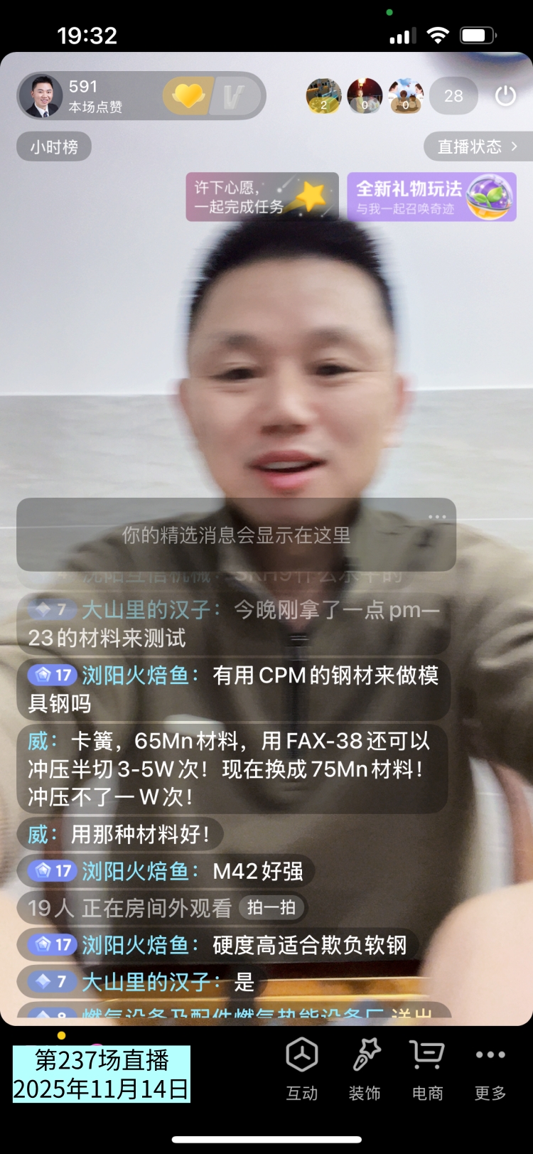 第237场直播间网友提问,卡簧,65Mn材料,用FAX-38还可以冲压半切 3-5W次,现在换成75Mn材料,冲压不了1万次。