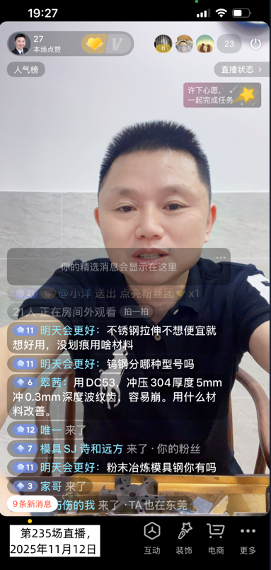 第235场直播间网友提问:用DC53,冲压304厚度5mm,冲0.3mm深度波纹齿容易崩,用什么材料改善?