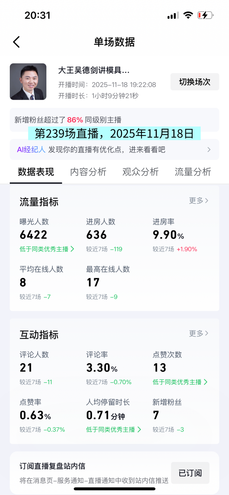 这场直播的曝光人数6422人次,观众人数636人,人均观看时长0.74分钟,这场直播,所有数据飘绿,特别是人均观看时长,跌破1分钟,平均在线人数,也是个位数,数据变差,值得反思。