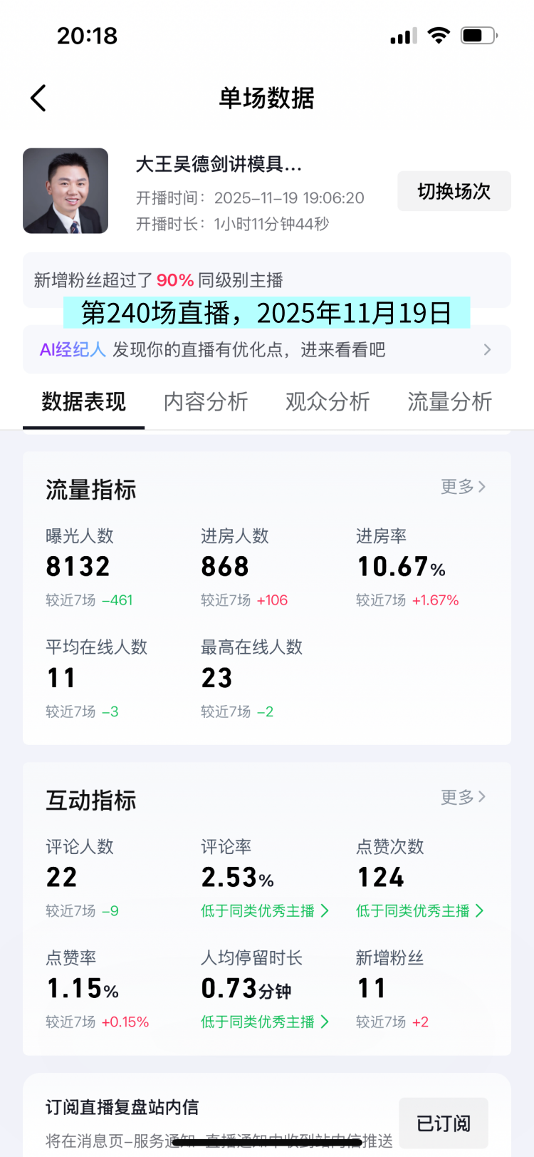 这场直播的曝光人数8132人次,观众人数868人,人均观看时长0.73分钟,这场直播数据较上一场有所提升,说明改变有点作用。