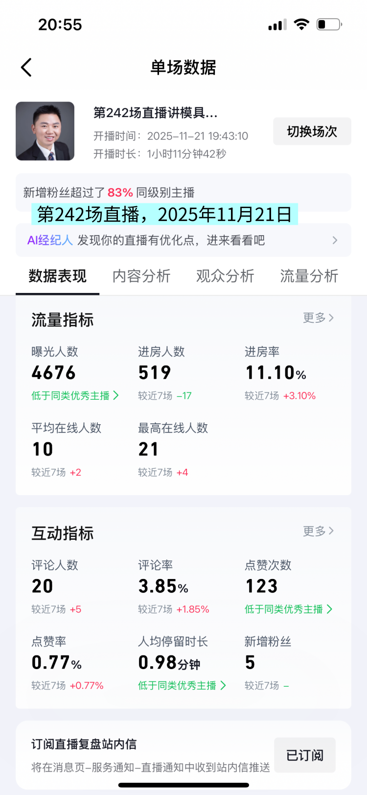 昨天晚上11月21日,我直播了1小时,这是我的第242场直播。