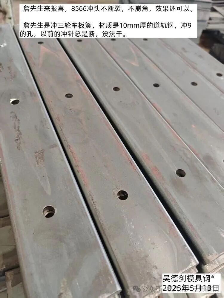 詹先生在10mm厚的道轨钢上冲9的孔,冲压孔径小于板厚,冲压比例小于1:1,以前的冲针总是断,没法干。但用8566冲针不断。