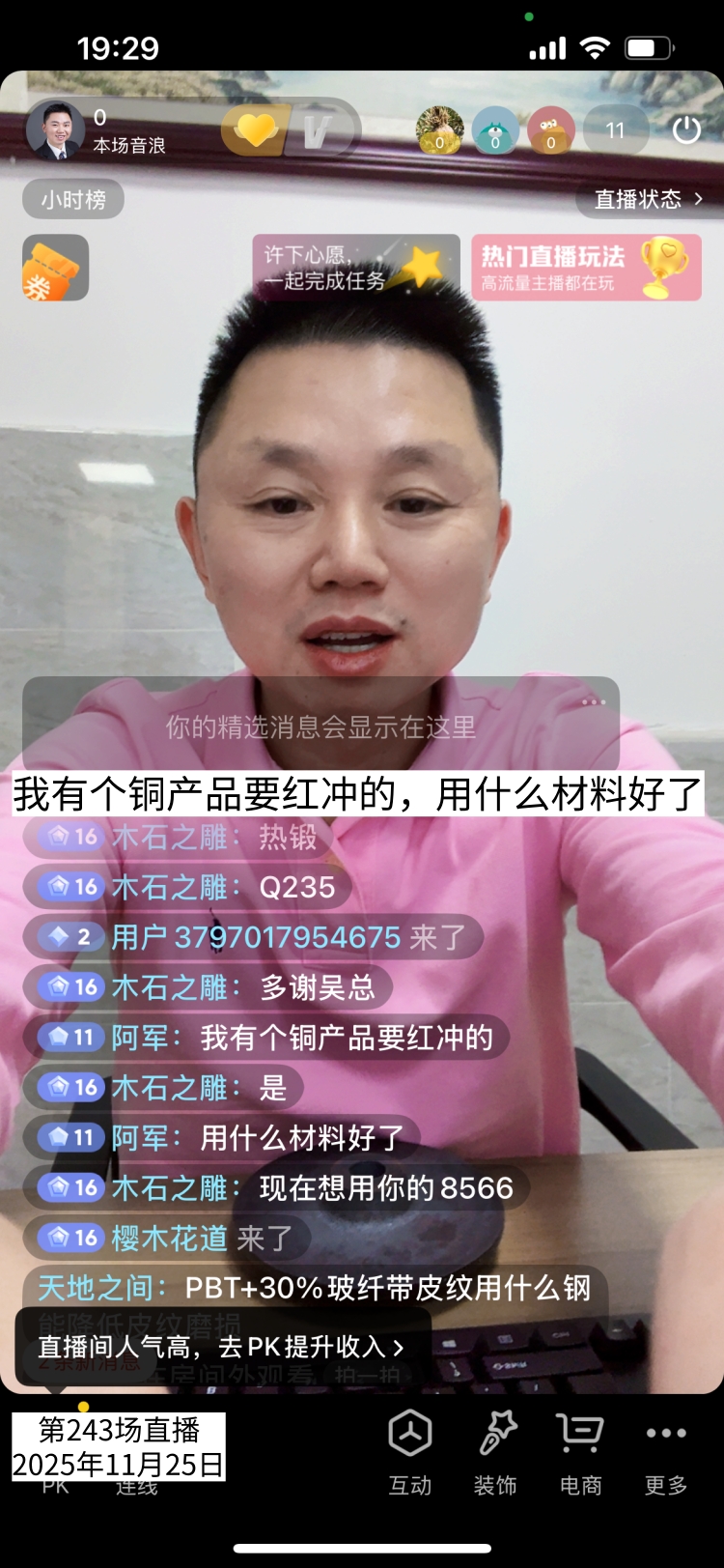 第243场直播间网友阿军提问,我有个铜产品要红冲的,用什么材料好呢?