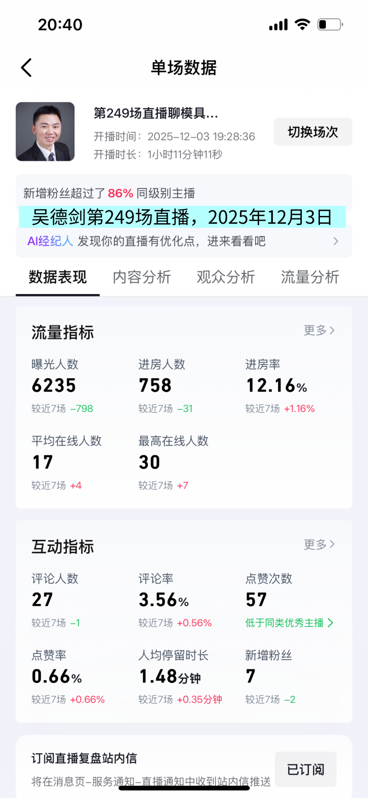 这场直播间的曝光人数6235,观众758人,人均观看时长1.48分钟,这场直播数据正常,重点是最高在线人数30人。