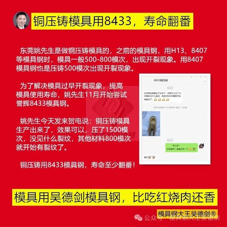 当然,我也很客观地告诉他,林先生验证,铜压铸模具用8433模具钢,寿命稳定在3万多模次,寿命是Y4的10几倍。虽然这是林先生两年多来,持续采购8433模具钢告诉我的验证结果。但是,林先生的工况,不代表你的工况,具体寿命,你还是要验证。