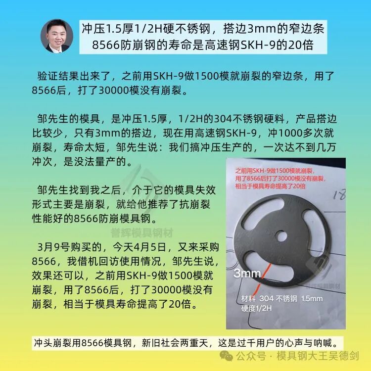 我们客户冲压冷镦后的2mm厚304不锈钢的碎冰机刀片,冷后的不锈钢材质很硬,产品又有很多细齿小尖角,飘出去又很多,这是行业内公认的难搞工况,冲头用DC53,四川8566、SKH-9,尖角处容易崩裂,冲一两个小时就崩角,但这3年多来,全靠8566防崩钢扛大梁,高兴得老板要请我喝酒。