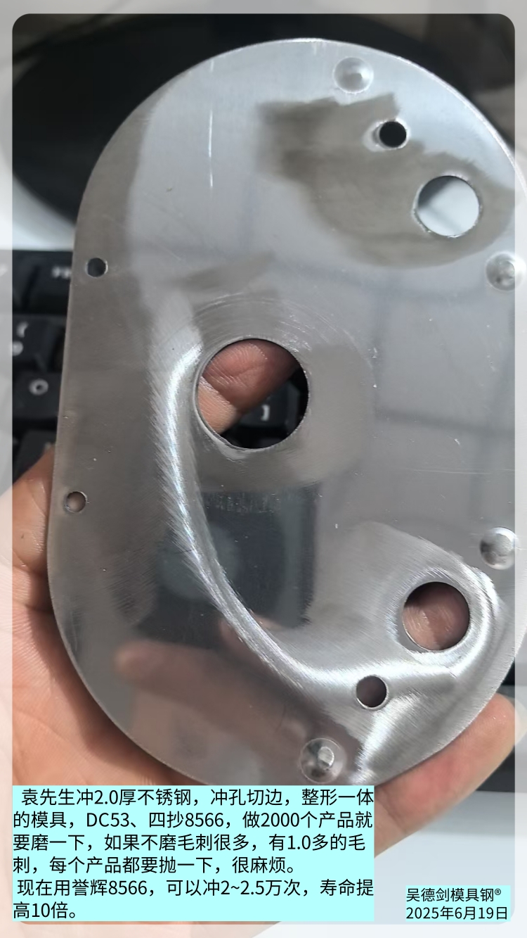 袁先生冲2.0厚不锈钢,冲孔切边、整形一体的模具,DC53、四抄8566,做2000个产品就要磨一下,如果不磨毛刺很多,有1.0多的毛刺,每个产品都要抛一下,很麻烦。但现在用誉辉8566,可以冲2~2.5万次,寿命提高10倍。产品不用抛光,生产快了很多,新旧社会两重天。
