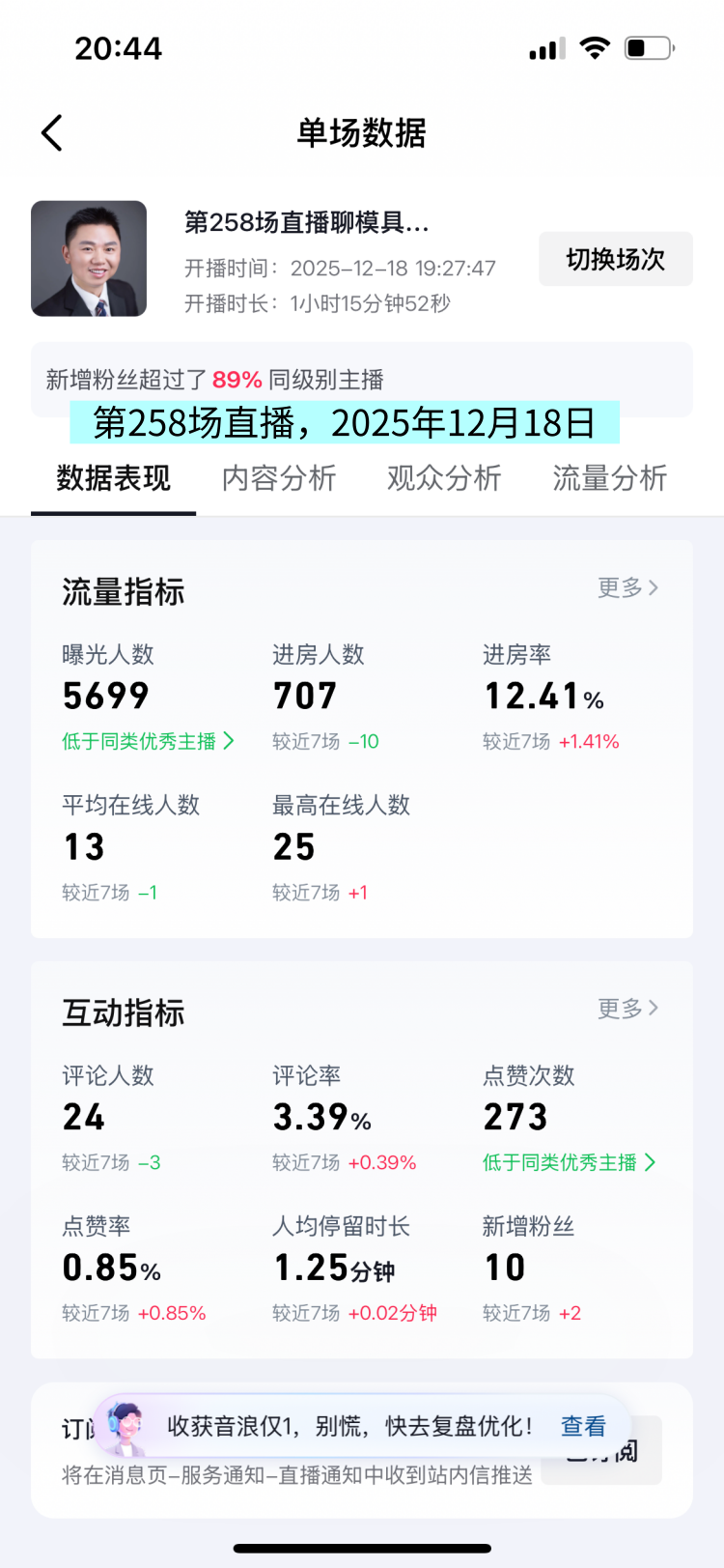 12月18日晚上,我直播了1小时,这是我的第258场直播。