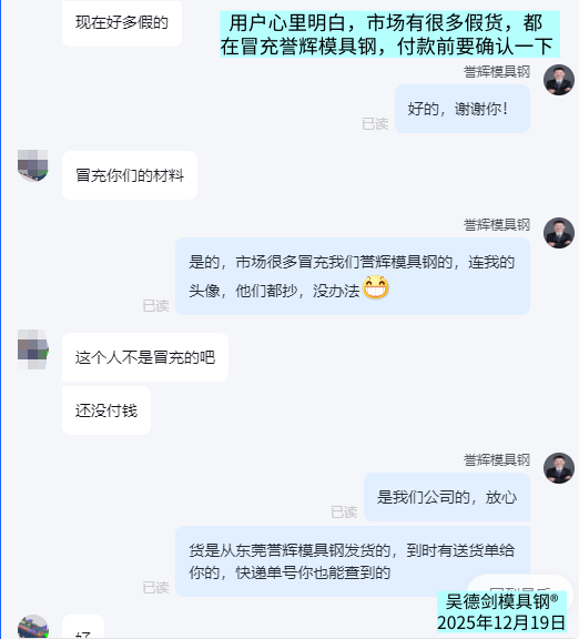 现在用户心里都明白,市场有很多假货,很多都在冒充誉辉模具钢,所以付款前要来确认一下。