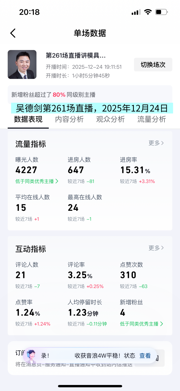 12月24日晚上,我直播了1小时,这是我的第261场直播。