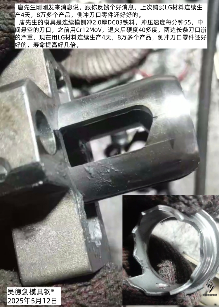 唐先生是连续模侧冲2.0厚DC03铁料,冲压速度每分钟55,中间悬空的刀口,之前用Cr12MoV,退火后硬度40多度,两边长条刀口崩的严重,现在用LG材料连续生产4天,8万多个产品,侧冲刀口零件还好好的,寿命提高好几倍。