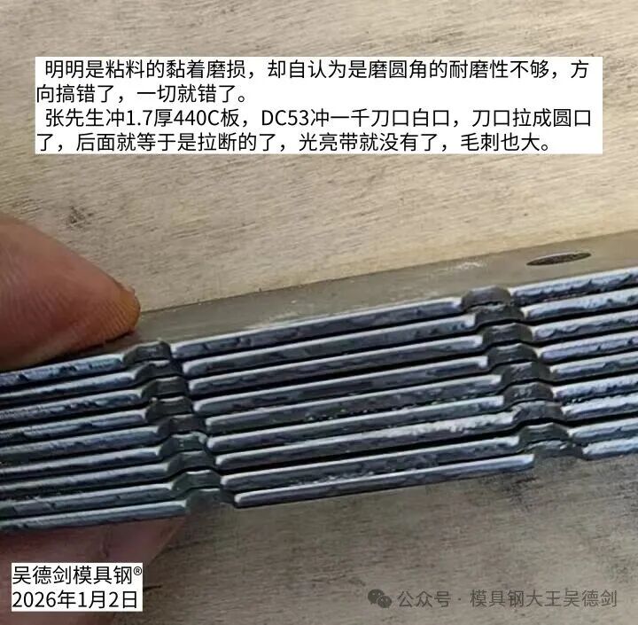张先生冲压1.7厚440C不锈钢板,DC53冲一千刀口白口,刀口拉成圆口了,后面就等于是拉断的了,光亮带就没有了,毛刺也大,问有什么耐磨性更好的模具钢?