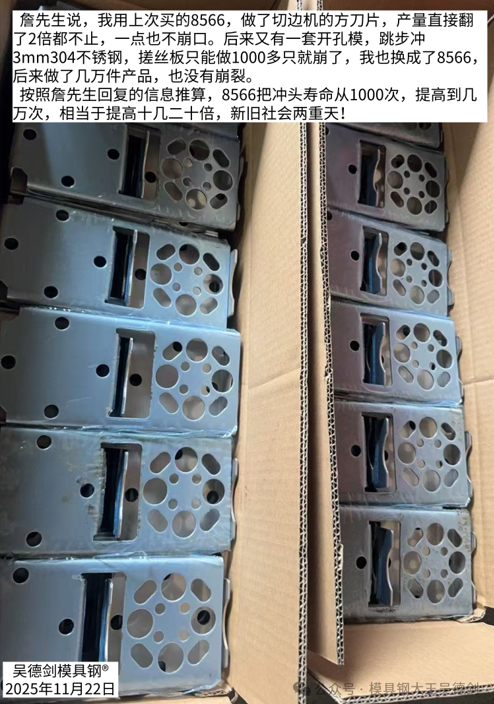 詹先生说,我用上次买的8566,做了切边机的方刀片,产量直接翻了2倍都不止,一点也不崩口。后来又有一套开孔模,跳步冲3mm的304不锈钢圆孔,搓丝板冲1000多次就崩了,我也换成了8566,后来做了几万件产品,也没有崩裂。