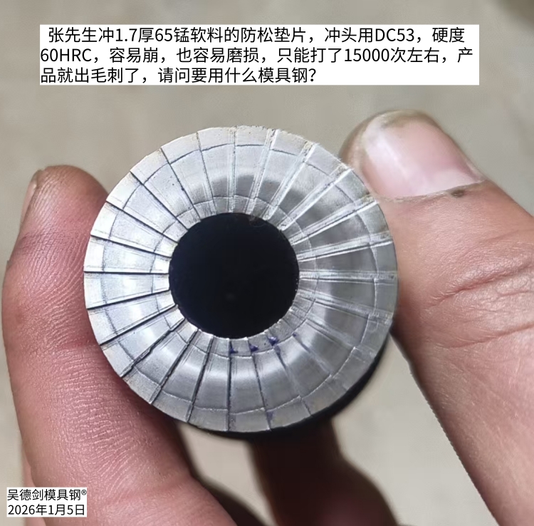 收到张先生咨询,冲压1.7厚65锰软料的防松垫片,有花纹的冲头容易磨损,寿命太短,现在用DC53的,硬度60HRC,容易崩,也容易磨损,只能打了15000次左右,产品就出毛刺了,请问要用什么模具钢?