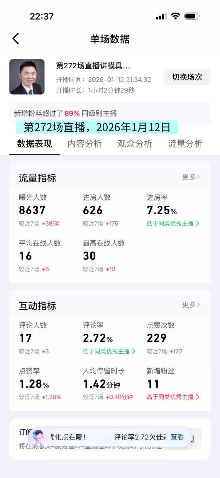 这场直播间的曝光人数8637人,观众626人,人均观看时长1.42分钟,平均在线人数16人,最高在线人数30人。周一的这场直播,数据是飘红的小阳春。数据好,直播就有成就感。