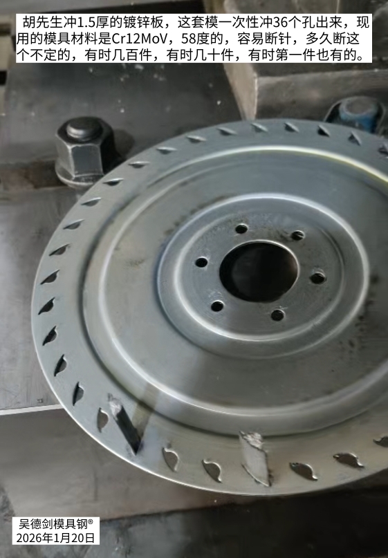 所以,胡先生你现在冲压1.5厚的镀锌板,一次性冲36个孔出来,现用的Cr12MoV,冲几十件就断的,有的上去就断的,你更应该采用8566防崩钢。否则像你这样几十件就断,就要拆模换冲针,生产是没法搞的。