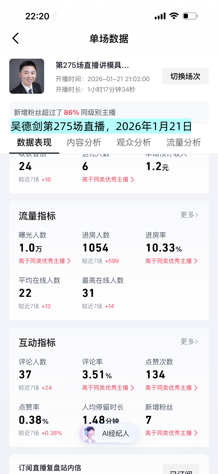 2026年1月21日星期三晚上,我做了1小时17分钟的直播,这是我的第275场直播。