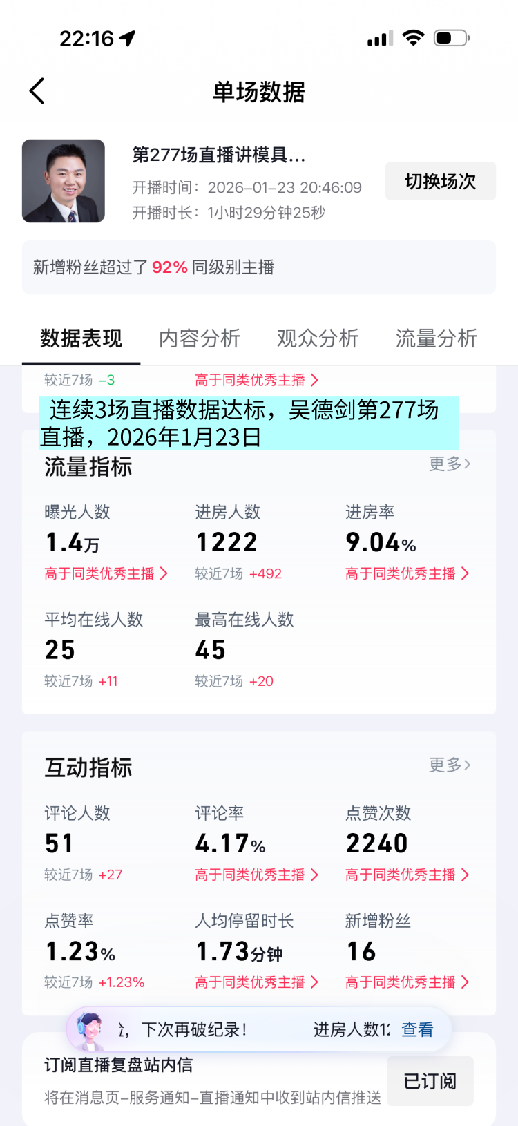 这场直播间的曝光人数1.4万人,观众1222人,人均观看时长1.73分钟,平均在线人数25人,最高在线人数45人。这场直播数据又有新突破,连续3场直播数据达标,挺好的。