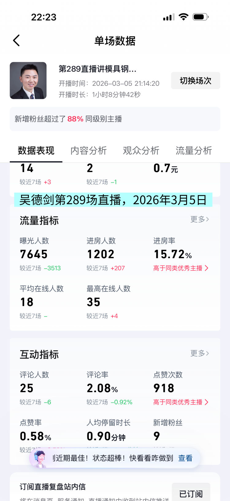 这场直播间的曝光人数7645人次,观众1202人,人均观看时长0.90分钟,平均在线人数18,最高在线35人,这场直播数据较上一场有所提高,好现象。