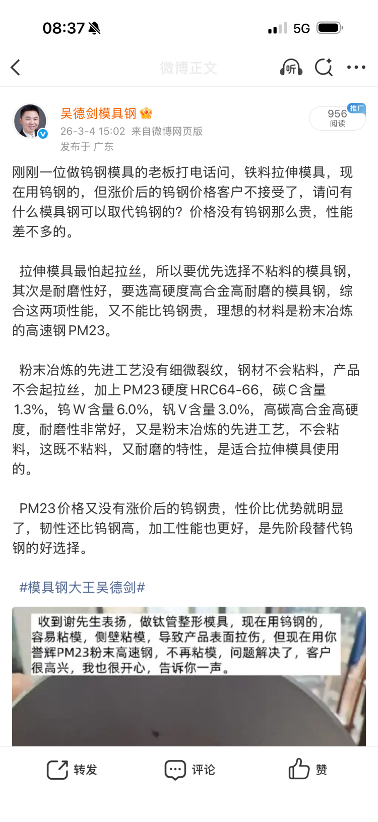 如果你的冷镦模具,拉伸模具,现在用钨钢,成本吃不消的,首先推荐你用PM23粉末高速钢来代替,这是明智之选。