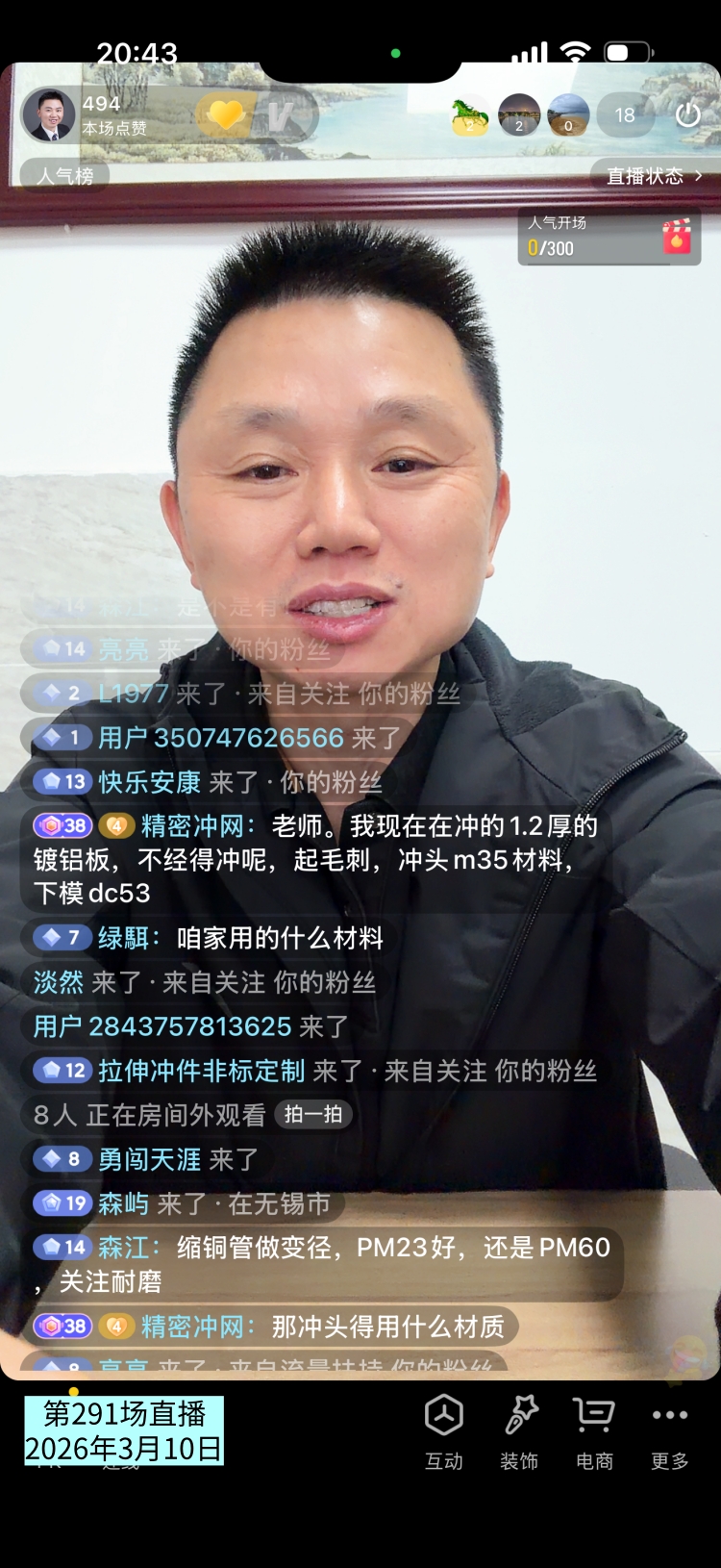 第291场直播间网友提问:老师。我现在在冲的1.2厚的镀铝板,不经得冲呢,起毛刺,冲头M35材料,下模DC53。