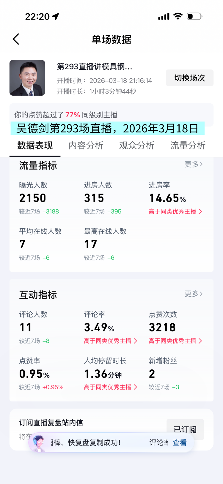 2026年3月18日的星期三晚上,我做了1小时直播,这是我的第293场直播。