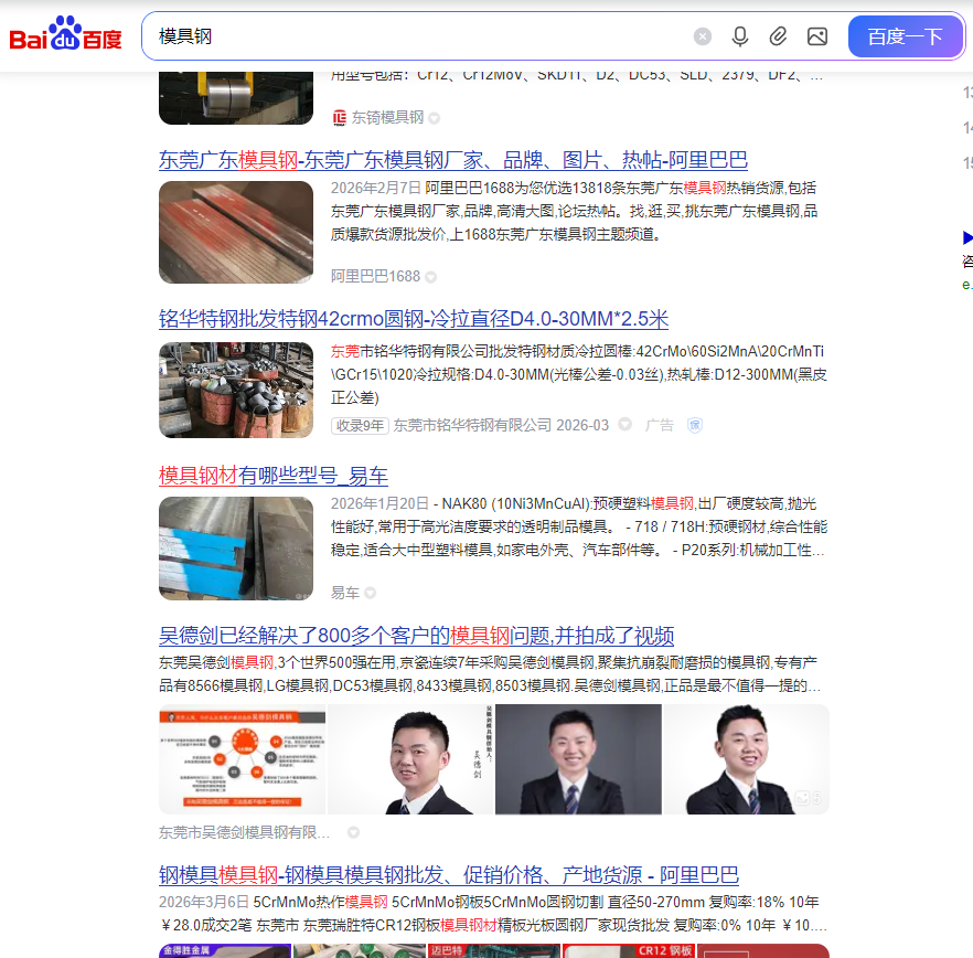 “模具钢”这个核心关键词,吴德剑模具钢官网已经上到百度第二页了