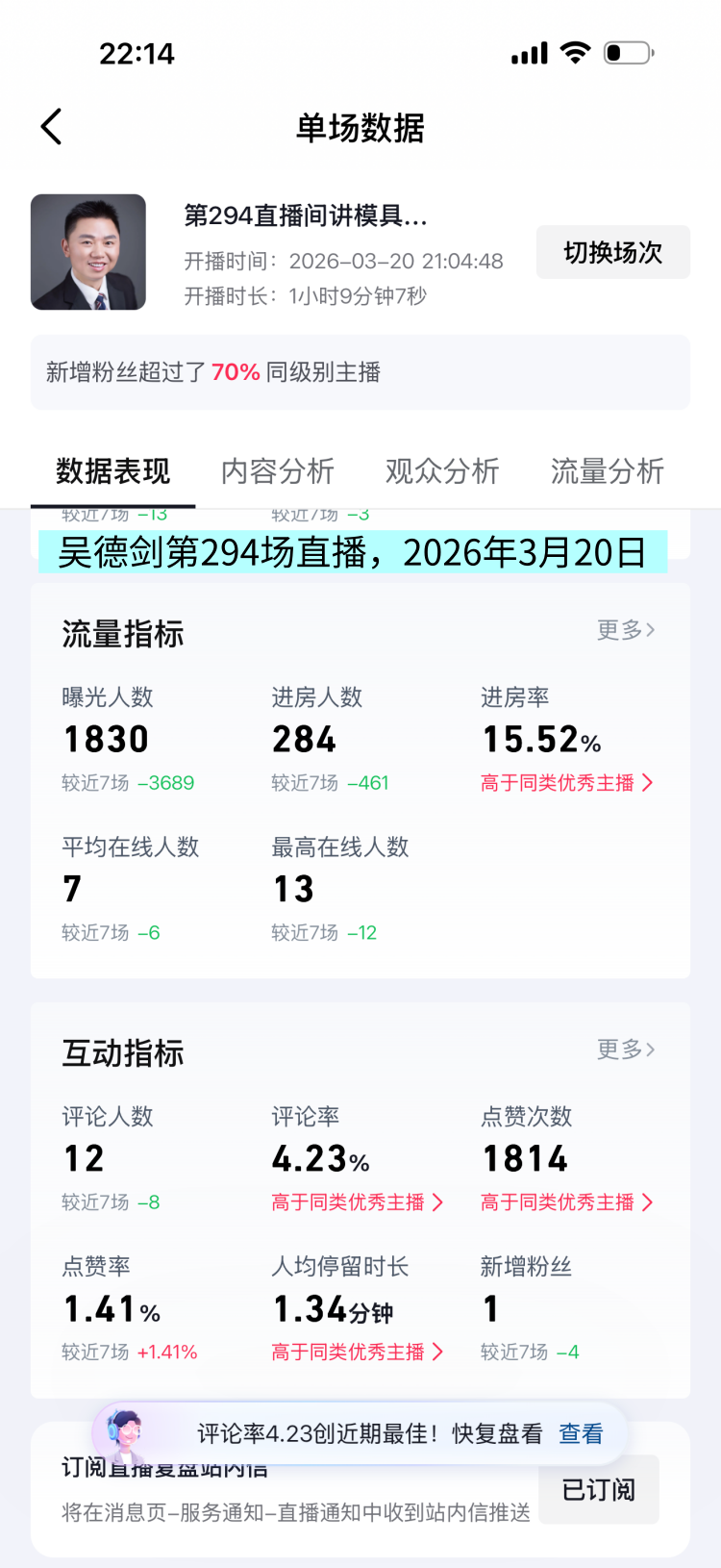 这场直播间的曝光1830人次,观众284人,人均观看时长1.34分钟,平均在线7人,最高在线13人,这场直播数据又跌入低谷,并再创造新低,搞得我心情低落。