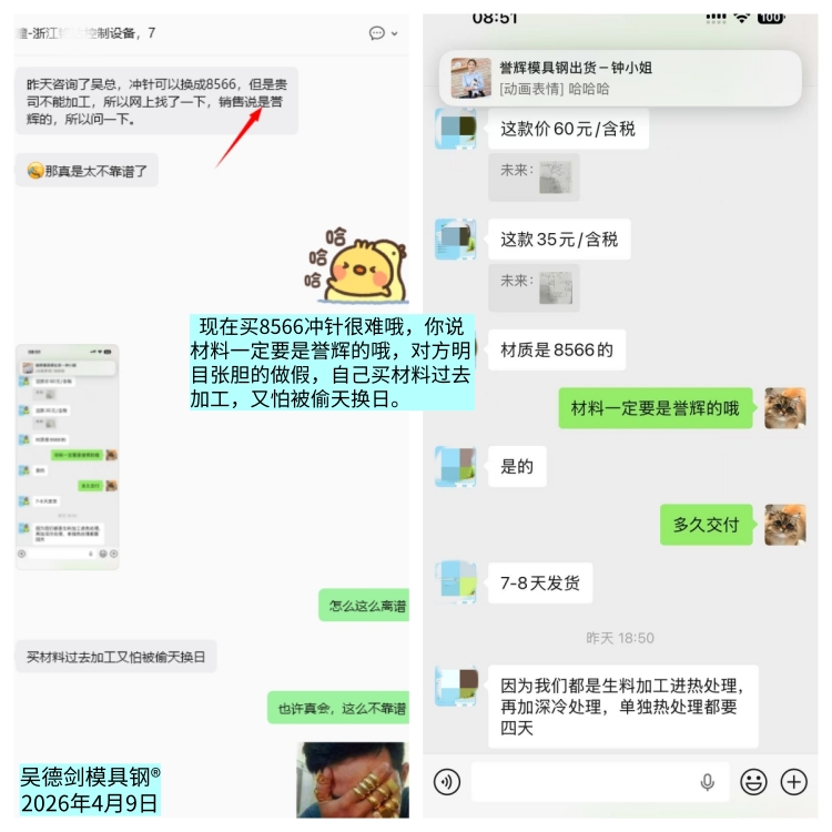 正说着,一位客户就来反馈和确认了。他昨天咨询过我,冲针可以换成8566,但是贵司不能加工,所以网上找了一下,找到深圳一家宣传做得很好的冲针厂,指定他8566材质要誉辉的。销售说是誉辉的,但他不放心,所以问一下。