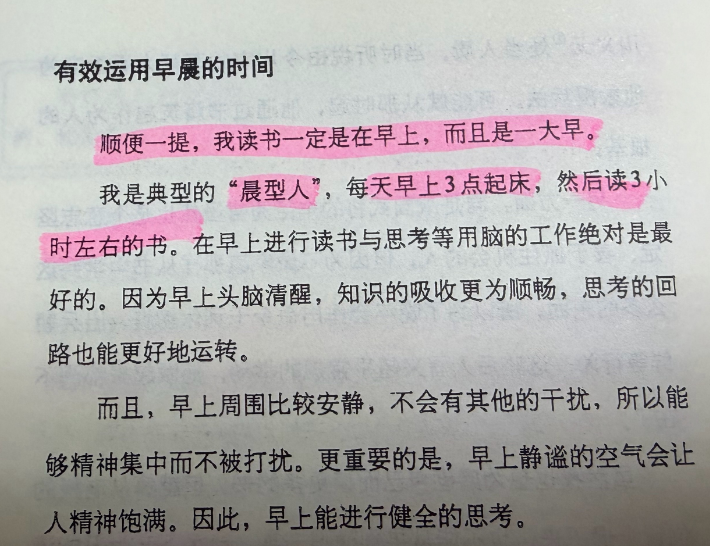 他的读书和思考都安排在早上。他一般3:00起床,读3个小时的书。