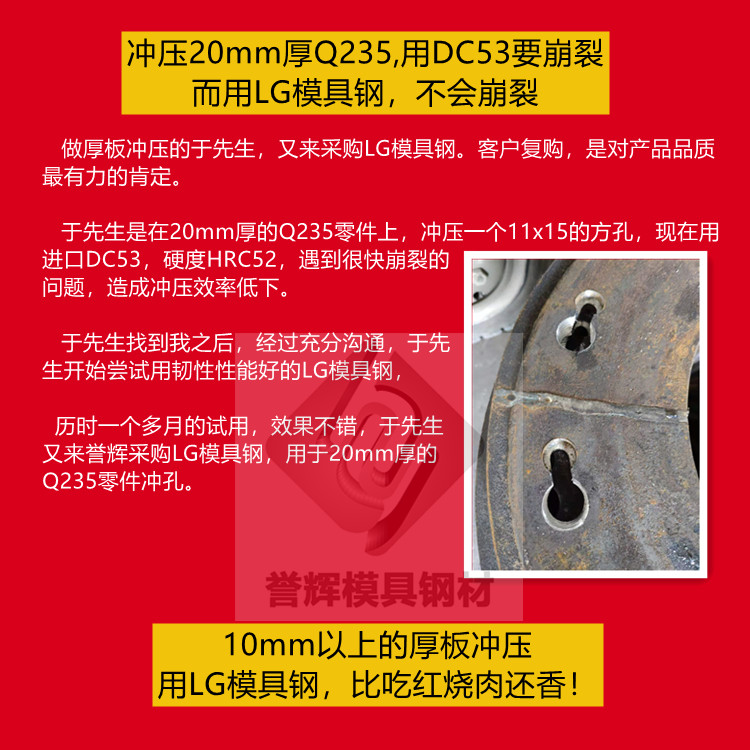 这个提问,让我想起于先生的案例,他是在20mm厚的Q235上冲11*15的方孔,用DC53模具钢,硬度52HRC,很快崩裂,没法干,后来就是用LG模具钢解决崩裂问题的,冲头寿命提高、效率提高。