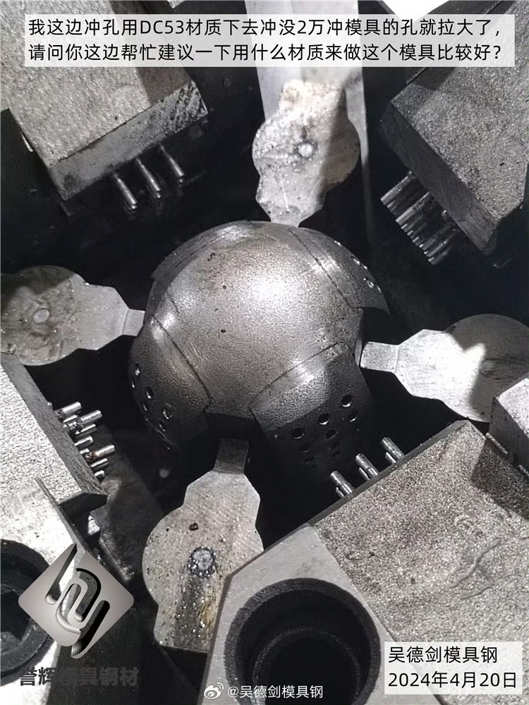 加微信好友两年多的林先生咨询,我这边冲孔用DC53材质下去冲没2万冲模具的孔就拉大了,请问你这边帮忙建议一下用什么材质来做这个模具比较好?