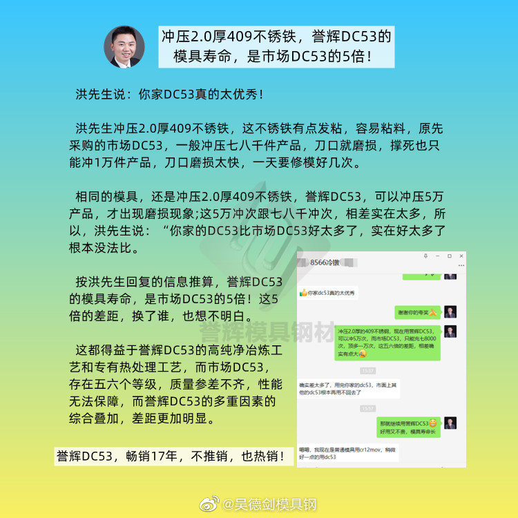 大连洪先生说:你家的DC53太优秀了,冲压2mm厚409不锈铁,你家DC53的模具寿命是市场DC53的5倍。