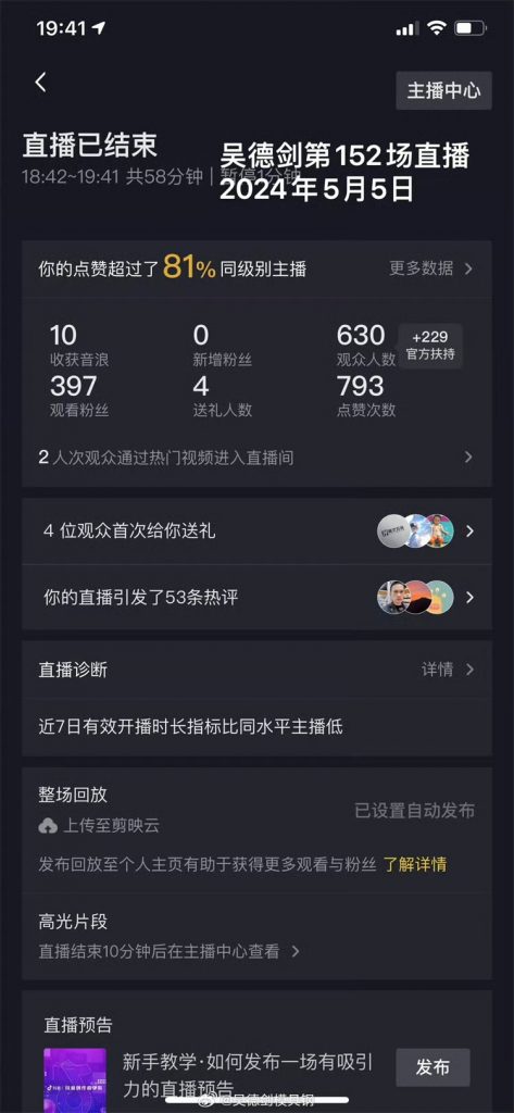 2024年5月5日的1小时直播结束,这是我的第152场直播。
