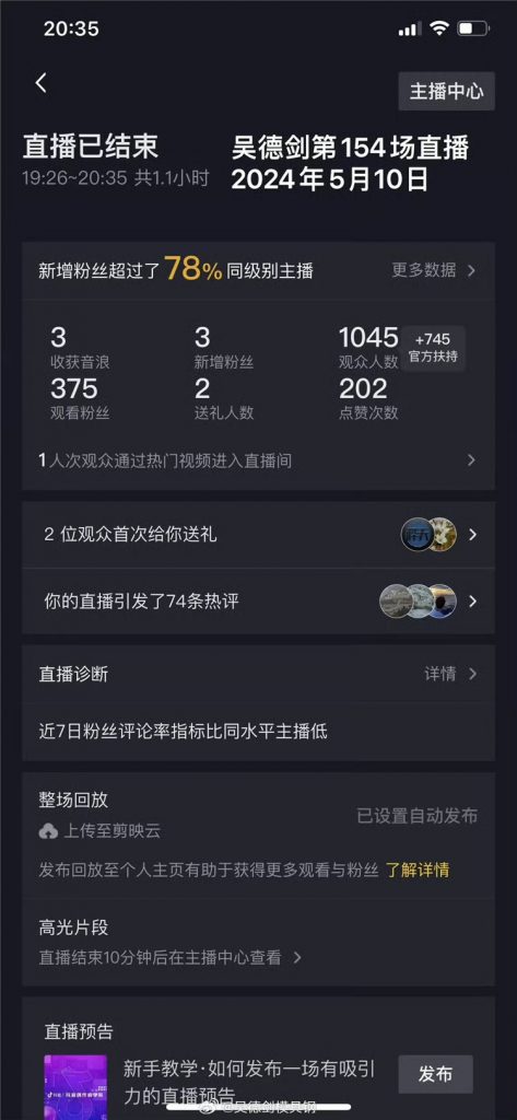 这场直播,有个数据值得关注,观众人数1045人,其中官方扶持745人,粉丝观众375人。这场直播有将近2/3的观众是没有关注过我的新人,相当于这场直播,我在745位新人面前展现过,这流量很大;对于这点,我有正反两面的解读。