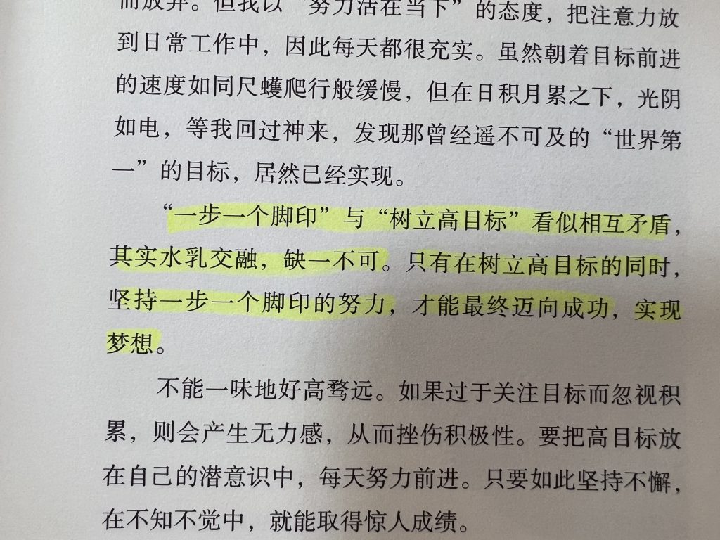 “一步一个脚印”与“树立高目标”看似相互矛盾,其实水乳交融,缺一不可。只有在树立高目标的同时,坚持一步一个脚印的努力,才能最终迈向成功,实现梦想。