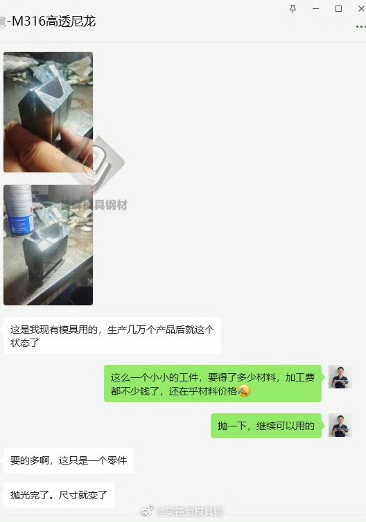 所以许老板的尼龙高透产品用M316模具钢,肯定是没有问题的。吴德剑模具钢,用户的参谋长,用过的都买账。