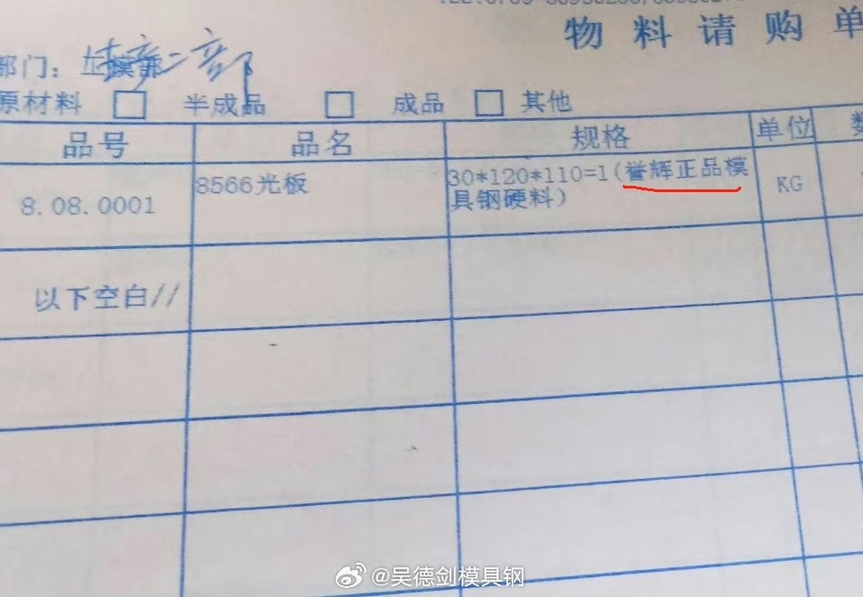 这个8566的申请单备注写得好,誉辉正品模具钢硬料。